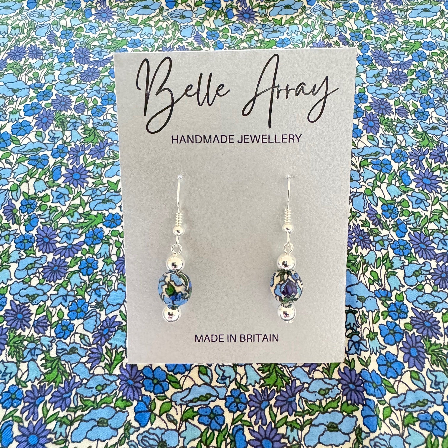 Short dangly earrings made from vintage Liberty Poppy Forest fabric in a stunning blue and green floral design.